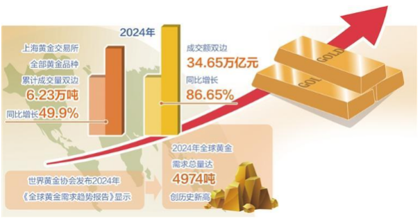 从国内市场看,中国黄金协会此前发布数据显示,2024年,面对黄金价格波动,我国黄金市场呈现快速发展势头,黄金市场成交量、成交额大幅增长。上海黄金交易所全部黄金品种累计成交量双边6.23万吨,同比增长49.9%,成交额双边34.65万亿元,同比增长86.65%;上海期货交易所全部黄金品种累计成交量双边18.22万吨,同比增长46.71%,成交额双边83.96万亿元,同比增长75.81%。