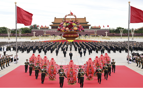 纪念碑前,2400多名各界代表手持鲜花,列队肃立。他们中有耄耋之年的老战士、老同志,有胸前佩戴着红飘带的烈士亲属,有国家勋章和国家荣誉称号获得者代表,有受表彰的民族团结进步模范代表,有朝气蓬勃的青年学生和少年儿童。