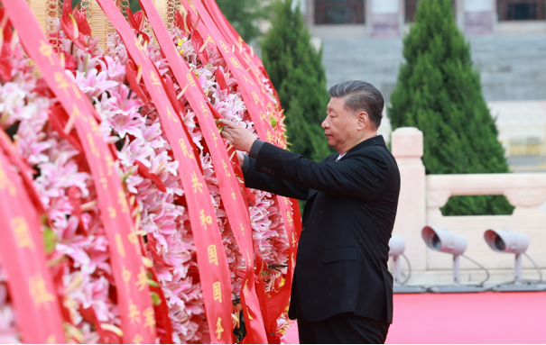 9月30日上午,党和国家领导人习近平、李强、赵乐际、王沪宁、蔡奇、丁薛祥、李希、韩正等来到北京天安门广场,出席烈士纪念日向人民英雄敬献花篮仪式。这是习近平整理花篮上的缎带。新华社记者 王晔 摄
