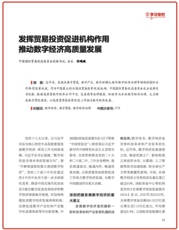 党的十八大以来,以习近平同志为核心的党中央高度重视发展数字经济,将其上升为国家战略。习近平总书记强调,“数字经济是全球未来的发展方向”,要“不断做强做优做大我国数字经济”。党的二十届三中全会通过的《中共中央关于进一步全面深化改革、推进中国式现代化的决定》提出健全促进实体经济和数字经济深度融合制度,对加快构建促进数字经济发展体制机制、完善促进数字产业化和产业数字化政策体系等作出新部署。中国国际贸易促进委员会(以下简称“中国贸促会”)将坚持以习近平新时代中国特色社会主义思想为指导,全面贯彻落实党的二十大和二十届二中、三中全会精神,强化联通政企、融通内外、畅通供需功能,以高质量贸易投资促进工作助力数字经济发展,为数字中国建设作出更大贡献。