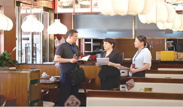 河南省漯河市郾城区纪委监委围绕公款吃喝、违规接受管理服务对象宴请等违反中央八项规定精神问题开展监督检查,一严到底狠刹歪风邪气。图为近日,该区纪检监察干部在辖区某饭店了解相关情况。王晓 摄
