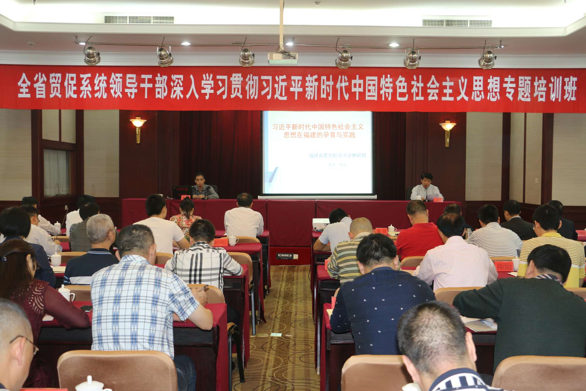 为深入学习贯彻习近平新时代中国特色社会主义思想和党的十九大精神,进一步促进全省贸促系统领导干部提高政治站位、强化政治担当,牢固树立“四个意识”、坚定“四个自信”,更加自觉地用习近平新时代中国特色社会主义思想武装头脑、指导实践、推动工作,为坚持高质量发展落实赶超服务,福建省贸促会于2018年10月29-30日在福州举办全省贸促系统领导干部深入学习贯彻习近平新时代中国特色社会主义思想专题培训班。