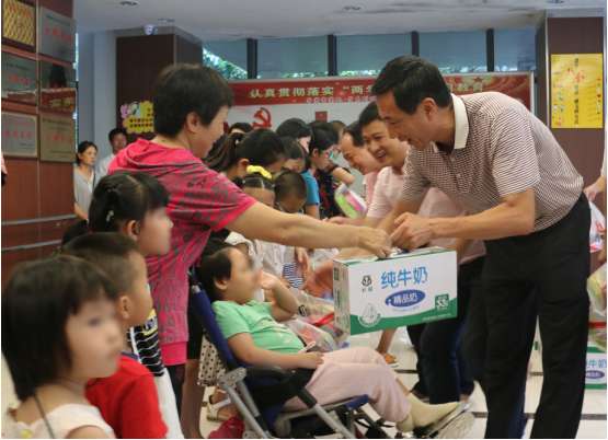 党员、团员向残疾小朋友赠送慰问品