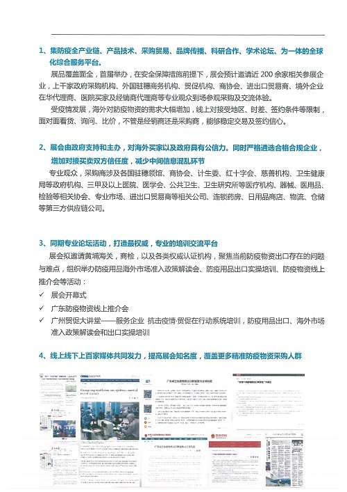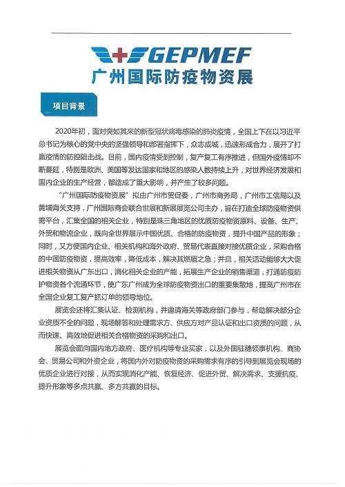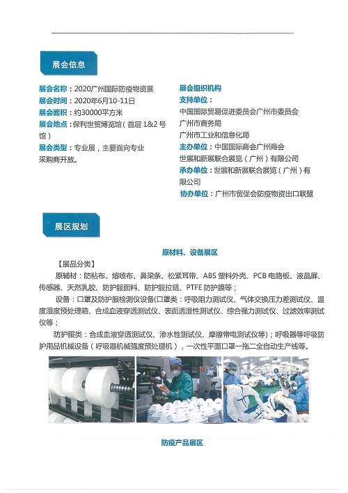 为贯彻落实习近平总书记关于夺取疫情防控和经济社会发展“双胜利”的重要指示精神,根据市委、市政府关于做好“六稳”“六保”的工作要求,由广州市贸促会、广州市商务局、广州市工业和信息化局支持,广州国际商会、世展和新展联合展览(广州)有限江南网站共同主办的“2020年广州国际防疫物资展览会”定于2020年6月10-11日在广州琶洲保利世贸博览馆举办。